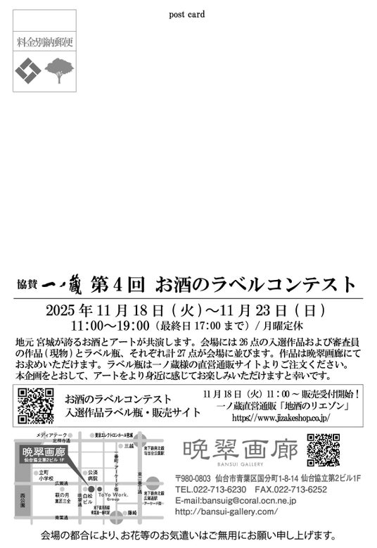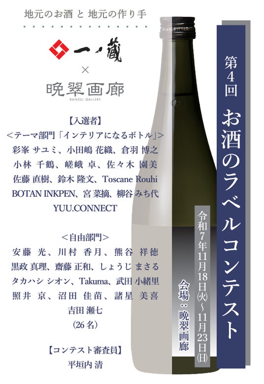 アートギャラリー 晩翠画廊(宮城県仙台市)は、2025年11月18日(火)~11月23日(日)まで「第4回 お酒のラベル コンテスト」の作品展を開催する。