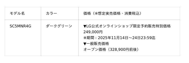 LGエレクトロニクス・ジャパン株式会社(代表取締役:孫 成周(ソン・ソンジュウ)、本社:東京都中央区)は、衣類ケア家電「The All New LG Styler(TM)」の最新モデル「SC5MNR4G(ダークグリーン)」の一般販売を、2025年11月25日(火)より開始します。これに先立ち、本日2025年11月14日(金)から11月24日(月・祝)23:59の間、LG公式オンラインショップ限定で、想定実売価格の24%オフとなる特別価格249,000円(税込)でお求めいただける予約販売を実施します。