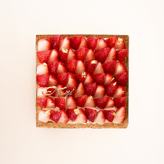 真っ赤に輝くいちごをひとつひとつ丁寧に並べた、ストロベリーのスクエアボックスタルト”。