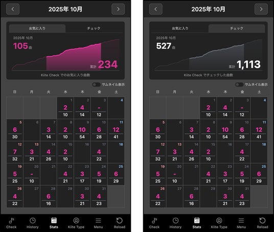 さらに、3分間あればKiite Checkで10曲チェックすることが可能なので、日々のすきま時間で新たな楽曲に出会う楽しさを得ることを後押しするために、図3(b)のように、毎日何曲チェックをして何曲お気に入りに追加したかというチェック実績をカレンダー上で一覧表示する機能も備えている。その上に、これまでに自分がチェックした総曲数のグラフも表示され、達成感を得ながら好みの楽曲を発掘する喜びを体験しやすくなっている。