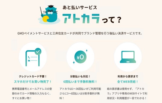 また「アトカラ」は36回までの長期分割払いにも対応しており、6回払いまで分割払い手数料が無料※となります。他にも「利用から請求まで完全WEB完結」を採用していること、および実店舗でもご利用いただけることが「アトカラ」の主な特長です。より幅広いお買い物シーンでのご利用と便利で柔軟なお支払いを実現します。