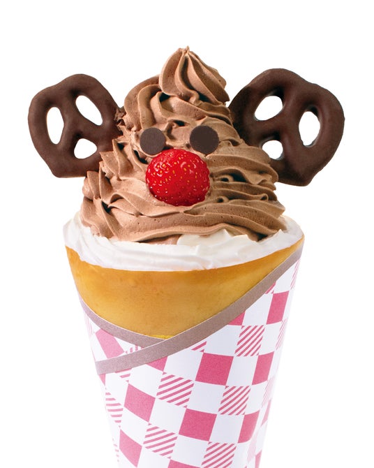 ホイップクリームとチョコレートホイップ、チョコソースをたっぷり使用し、甘酸っぱいいちごを組み合わせた一品です。トナカイの角にはサクサクとしたプレッツェルをトッピングし、食感も楽しめるクレープに仕上げました。