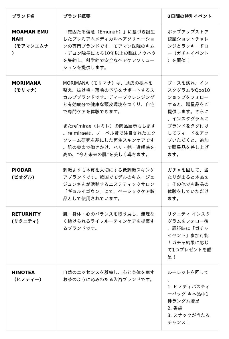 さらに、韓国ですでに話題沸騰中のラインナップや、日本ではまだ発売されていないブランドの新商品を会場で初公開! 正式発売前に、製品を直接手にとって、感触や効果を試せる体験スペースが充実しています。これは、ポップアップでしか味わえない特別な特典であり、流行に敏感なコスメオタクにとって「次の推し」を最速で見つける絶好の機会です。