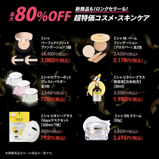 株式会社ミシャジャパン(本社:東京都港区)が運営するミシャジャパン公式オンラインショップ本店(https://www.misshajp.com)にて最大80%OFFの「ブラックフライデーセール」を2025年11月25日(火)12:00から11月28日(金)11:59まで開催いたします。