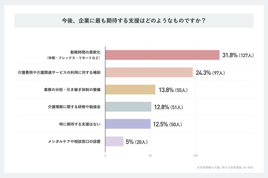 今後、企業にどんな支援を期待するかを尋ねたところ、最も多かったのは「勤務時間の柔軟化(フレックス制度・リモートワークなど)」で127人でした。