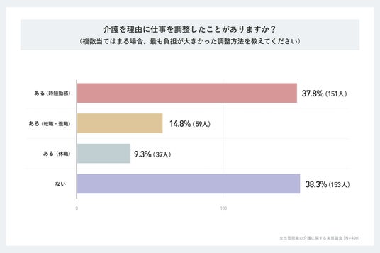 一方、「介護を理由に調整したことはない」と答えた人は153人で、全体の約38%でした。介護の必要性が働き方に具体的な影響を及ぼしているケースが約6割を占めています。