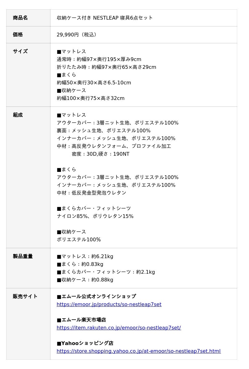 「身体に合った寝る・座る・たたむ」を提供する健康家具ブランドEMOORを展開する株式会社エムール(東京都立川市:代表取締役 高橋 幸司/以下エムール)は、2025年11月17日より『収納ケース付き NESTLEAP 寝具6点セット(以下、NESTLEAP 寝具6点セット)』の販売を開始しました。
