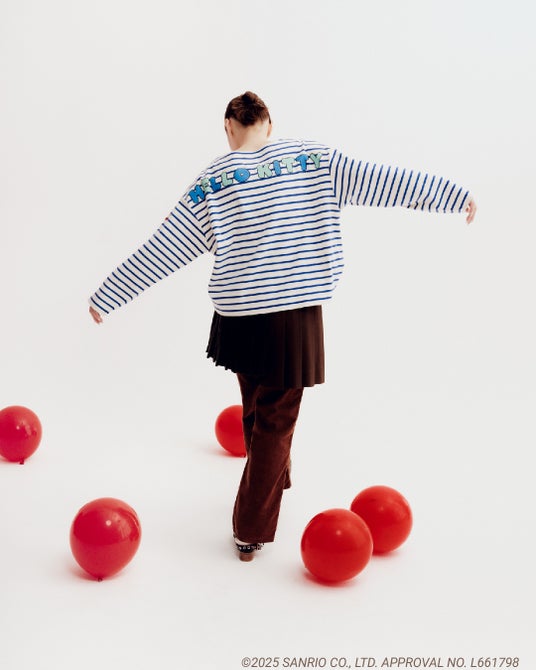 バックスタイルに大胆に「HELLO KITTY」のロゴをプリントしたゆったりとしたサイジングのボーダー柄カットソートップス。