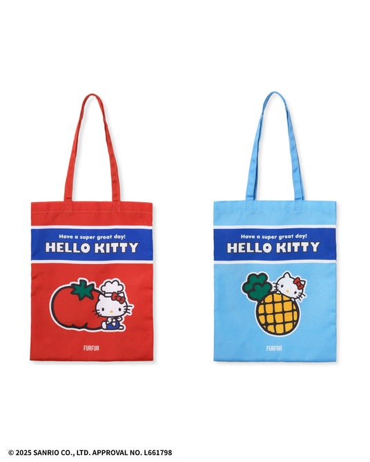 ハローキティのトマト缶詰とパイナップル缶詰のデザインが大胆にプリントされたトートバッグ。
