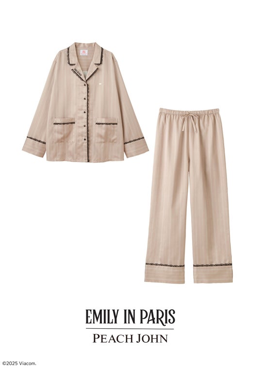 上品な光沢感のあるサテン生地を使用したシャツパジャマ。肌側には起毛加工を施し、ひやっと感が少ないあたたかみのある着用感。くるみボタンや黒のレースなど、甘すぎない可愛らしさがぎっしり詰まったデザイン。右襟に『Emily in Paris』のロゴ刺繡入り。