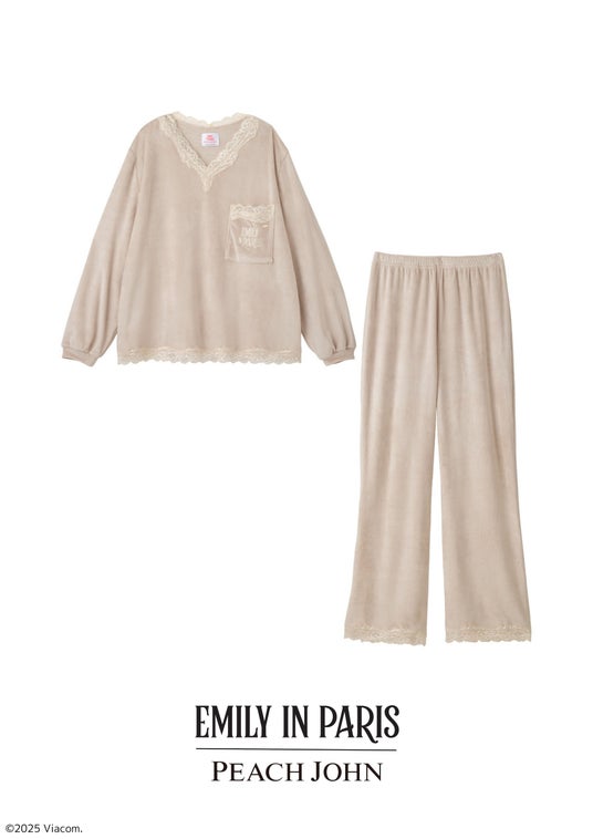 肌触りの良いベロア生地を使用したフェミニンなパジャマ。Vネック部分がカットレースで縁取られたフレンチテイストの甘すぎないかわいらしいデザインです。左胸のポケットに『Emily in Paris』のロゴ刺しゅうと、ロゴ入りゴールドプレート付き。
