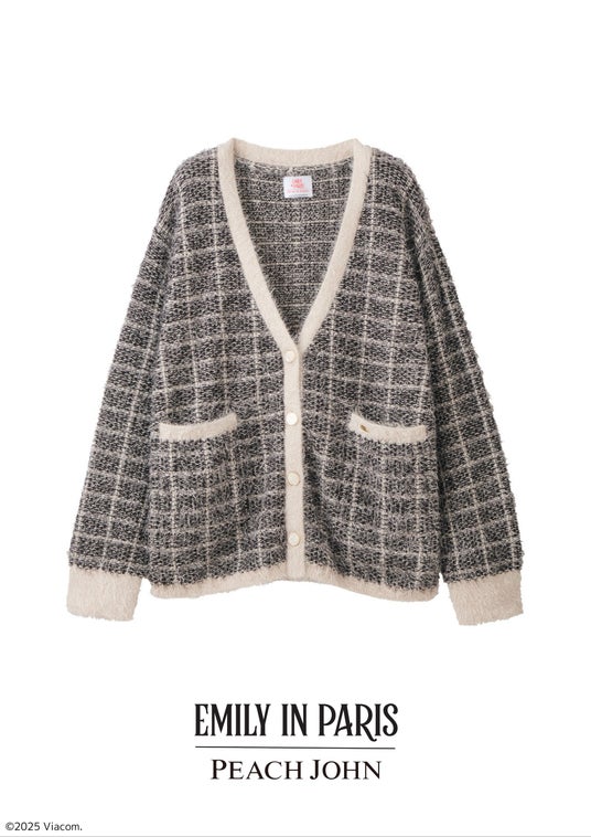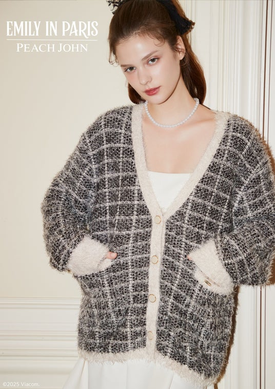 柔らかなチェック柄フェザーヤーンを使用したふわもこカーディガン。全体に施したラメ入りの糸や高級感のあるゴールドボタンがポイントのツイードジャケット風デザイン。左のポケットに『Emily in Paris』のロゴ入りゴールドプレート付き。