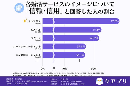 「信頼・信用」に当てはまると回答した割合は、『サンマリエ』が77.6%で最も高く、次いで『ムスベル』(65.3%)、『ツヴァイ』(63.7%)と続きました。4位は『パートナーエージェント』(54.6%)、5位は『エン婚活エージェント』(54.1%)でした。