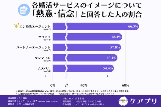 「熱意・信念」が当てはまると回答した割合は、『エン婚活エージェント』が66.5%で最も高く、次いで『ツヴァイ』(58.4%)、『パートナーエージェント』(57.8%)、『サンマリエ』(56.1%)、『ムスベル』(54.4%)と続きました。