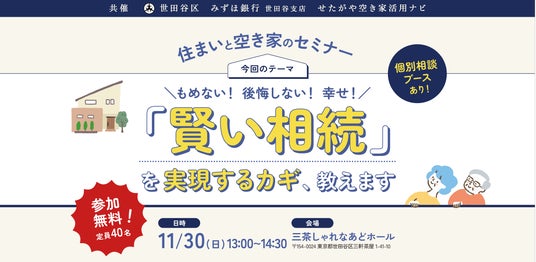 空き家の所有者さまへの積極的な対応をする世田谷区では、協定のもと運営する窓口である「せたがや空き家活用ナビ」と、同じく協定を結ぶみずほ銀行の3者共催で、皆様へのセミナーを開催します。終活をしないと陥ってしまう空き家のプロと、金融のプロであるみずほ銀行世田谷支店担当者が講演をします。