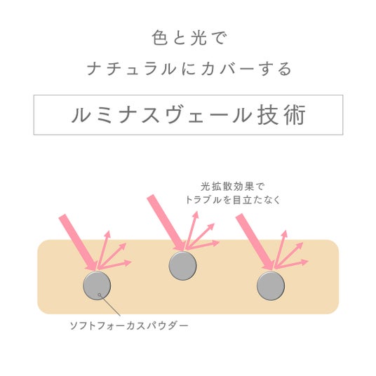球状のソフトフォーカスパウダーを配合し、色だけでなく光の拡散効果でトラブルを目立たなくする技術。光の増幅によって影を払拭することで、毛 穴や小ジワなどの凹凸もカモフラージュします。色は血色の良さを演出するピンクベージュにこだわりました。