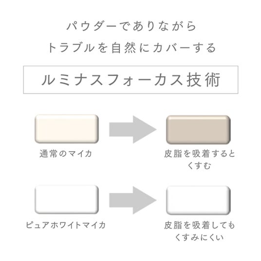 雪のように透明感あふれる仕上がりを目指し、白浮きを防ぎながら明るく仕上がりピュアホワイトマイカを高配合。くすみ補整パールやソフトフォーカスパウダー、セバムキャッチパウダーをバランスよく配合することで、明るく艶やかな仕上がりとくずれにくさを両立しました。