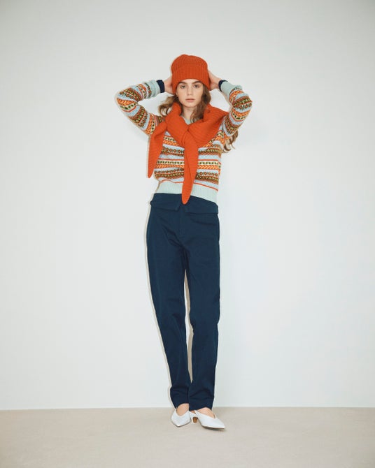 フェアアイルクルーセーター 14,000円 / トライアングルスカーフ 13,000円 /トライアングルビーニー 7,000円