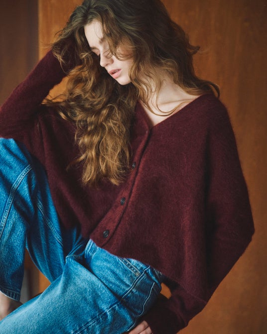 「色気を感じるハンサム」フォギーな風合いを素肌で飾るトップスにもなる深Vカーディガン