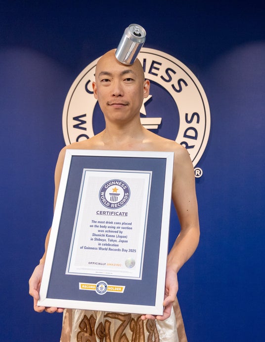 一方、日本では、2020年に初めて20本のドリンク缶を体につけ、「空気吸引で缶を体につけた最多数」に認定された菅野俊一さんが自ら記録を25本に伸ばしました。菅野さんは頭部のみに缶をつけた記録も2023年に更新しており、その記録は『ギネス世界記録2026』に掲載されています。