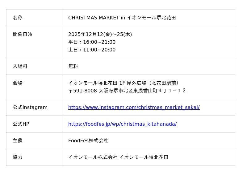 FoodFes株式会社(代表取締役:稲垣一馬)は2025年12月12日(金)~12月25日(木)の期間「CHRISTMAS MARKET in イオンモール堺北花田」をイオンモール堺北花田(大阪府堺市)の1F 屋外広場(北花田駅前)にて開催いたします。
