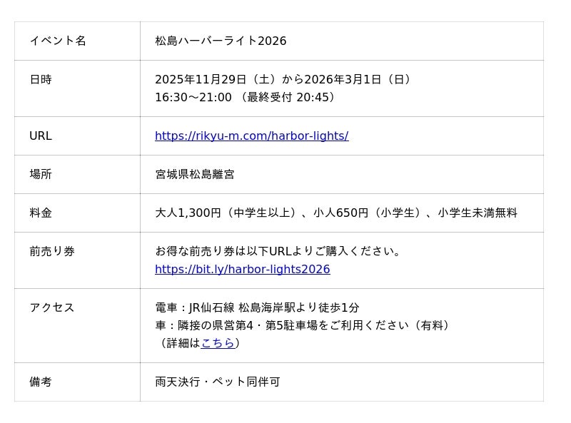 日本三景 松島にある観光複合施設「宮城県松島離宮」(運営会社:丸山株式会社)では、松島ハーバーライト2026 in 宮城県松島離宮を2025年11月29日(土)から2026年3月1日(日)まで開催いたします。