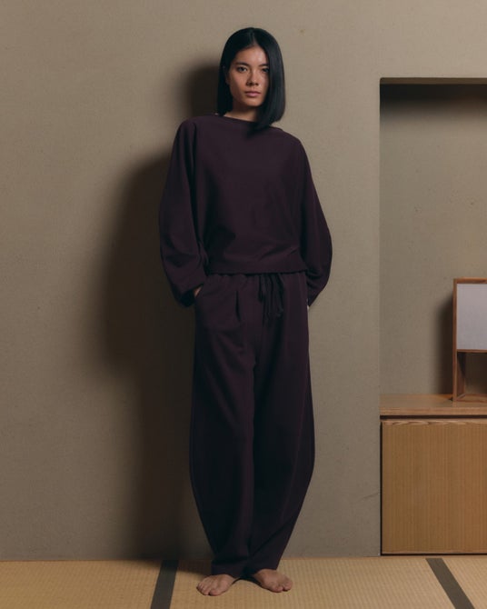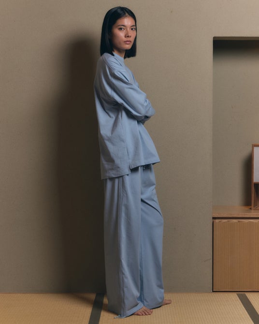 トップスは、2枚袖で生まれる自然なふくらみがやさしい陰影をつくり、動きに合わせて美しく揺れます。ゆるやかな襟ぐりと軽やかなフォルムで、日常に静かな抜け感を。パンツは、膝まわりにかけて丸みをもたせたフォルムが特長。