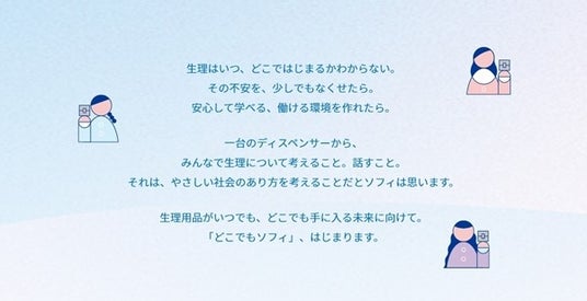 今回の取り組みでは、実証実験校となる沖縄県立陽明高等支援学校に、医薬品医療機器等法(薬機法)に基づいた完全密閉型個包装ナプキン(『ソフィSPORTS260羽つき』)と学校向けの「School Sofy」ディスペンサーを提供。