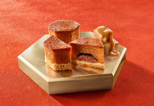 濃厚なコクのビターキャラメルペーストを、しっとりジューシーなバターキャラメルケーキに包んで王冠型に焼き上げました。ベースにしのばせたタルト生地が食感のアクセント。酪農王国ニュージーランド産バターの香りが、上品に響き合います。