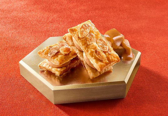 とろけるような柔らかさに仕立てた優しい甘さのバターキャラメルショコラクリーム。サクッと軽やかな108層のパイ生地にアーモンドスライスをまぶして、カリッと食感が楽しいフロランタン仕立てに焼き上げました。噛む度にほろ苦い香ばしさが口いっぱい広がります。
