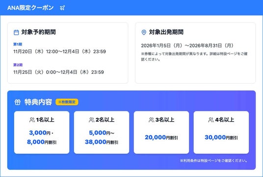 ※3 各キャンペーンにおける対象旅行期間などの条件が異なるため、同時に利用できない場合もあります。