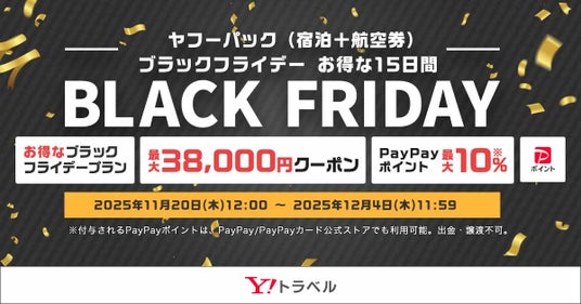 LINEヤフー株式会社(以下、LINEヤフー)が提供するインターネット旅行予約サービス「Yahoo!トラベル」は、2025年11月20日(木)から12月4日(木)まで、「ヤフーパック(宿泊+航空券)」(以下、ヤフーパック)を対象とした大型セール「ヤフーパック ブラックフライデーセール」(以下、本企画)を開催します。