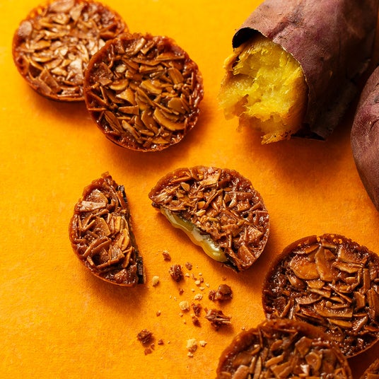 華やかな甘みのアーモンドフロランタンとバターサブレでミルクチョコレートと、さつま芋、バター、生クリームを合わせて炊き上げたスイートポテトキャラメルをサンドしました。