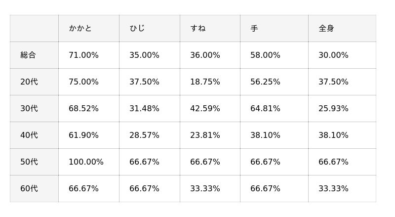 秋冬の乾燥悩みについて聞いたところ、全年代に共通して「かかと」や「手」など、露出や摩擦の多い部位で乾燥を感じる人が多く見られました。