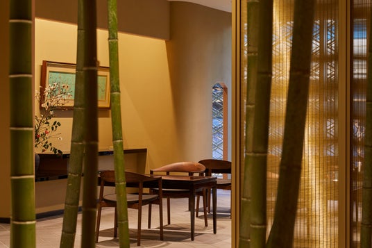 本格の立礼式茶室、季節を感じさせる床の間の設えを擁したオールデイダイニング。店内から吹き抜けにそよぐ竹林を臨み、ザ・キタノホテル東京が大切にする“和敬清寂”を体現しています。心落ち着く洗練の空間では、ボリュームや味わいを軽重で示し、体調や気分に合わせて選べる一品料理や、ランチセット、スイーツ、キタノオリジナルの紅茶などのドリンクなど多彩なメニューを提供。月に一度の茶道体験(英語も可)は、宿泊の有無を問わず参加可能、内外のゲストに好評を博しています(予約制)。