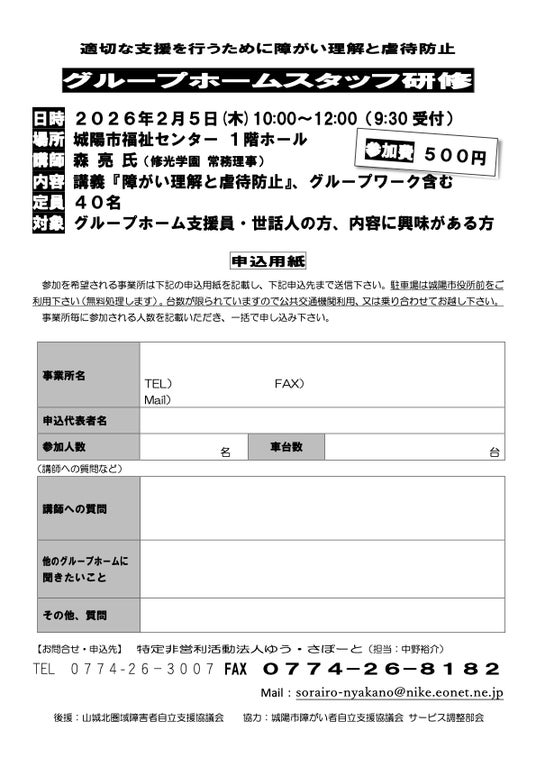 特定非営利活動法人ゆう・さぽーとは、城陽市障がい者自立支援協議会サービス調整部会の協力を受け、グループホームスタッフを対象とした研修会を2026年2月5日(木)に開催いたします。