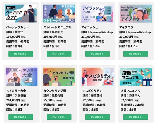 カット、カラー、パーマ、縮毛矯正、シャンプー、ヘッドスパ、アイラッシュといった技術科目に加え、集客、店販、ホスピタリティ、コーチング、組織マネジメントまで、サロン運営に必要な要素を体系的に学べます。