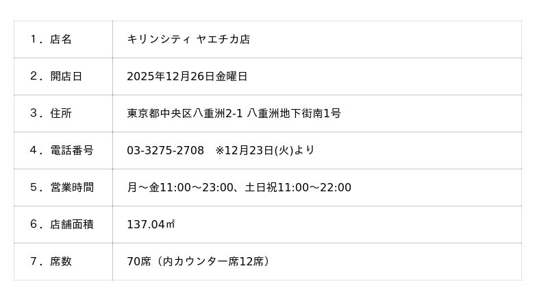 キリンシティ株式会社(本社:東京都中央区、代表取締役社長:波多野潤)は、2025年12月26日(金) 、東京・八重洲地下街の「キリンシティ ヤエチカ店」を全面リニューアルし、下記日程でリニューアルオープンいたします。