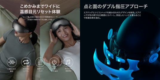 ・エアバッグ式加圧マッサージ:独自の3Dエアバッグ構造が目の周りを包み込み、まるで指圧のように優しくアプローチ。