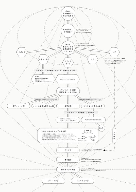 次のステップでは、試作したサンプルを香気成分分析装置で解析。その過程で、一般的な樽材として比較に用いた杉が、ホワイトオークや日本酒に含まれる成分とは異なる性質を持つ(分子量の大きさが異なる)ことに着目しました。異なる分子量の香気成分を組み合わせることで、香りに奥行きと温度による変化が生まれるのではないかと考えました。