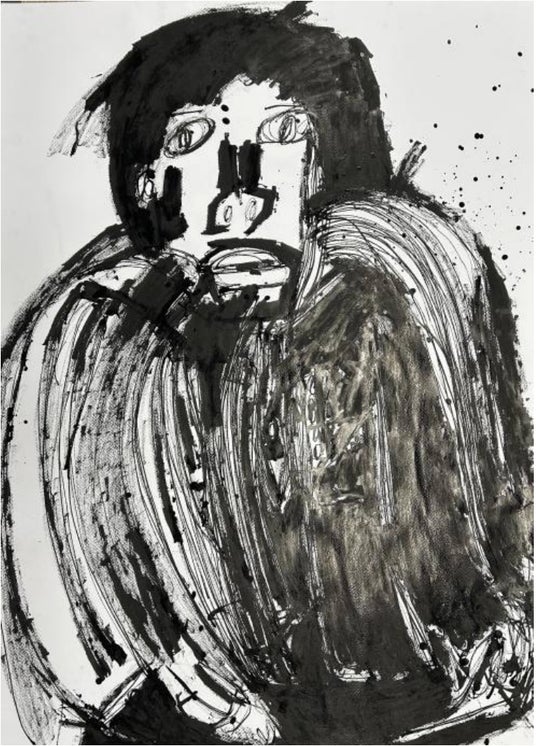 トラックが大好きな彼が、ある時からドライブ中に見た車を絵や陶土で表現するようになった。現在ではトラックに限らず、人物や風景画等、雑誌や画集をモチーフに墨汁と割り箸1本のみを使用して次々に作品を生み出してゆく。モチーフ全体を見ながら素早く筆を走らせ全体像を描き上げると、描いた線上を流れに添って何度も何度も塗り重ねる。飛び散った墨汁の滴や擦れ合わさった線が絵に躍動感をあたえていく。いつも、ひとりお気に入りの音楽を聴きながら、寝転がり肩肘付いて描く様が、彼のスタイルである。
