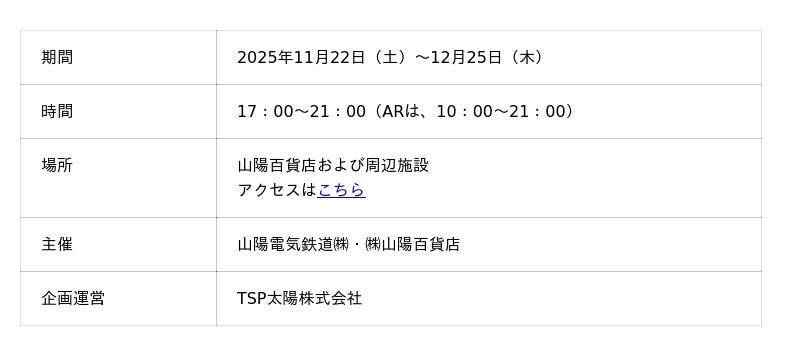 TSP太陽株式会社(本社:東京都目黒区、代表取締役社長:池澤 嘉悟)は、2025年11月22日(土)から12月25日(木)まで、兵庫県姫路市の山陽百貨店にて開催される「サンタさんの秘密のプレゼント工場」についてお知らせします。本イベントは、山陽電気鉄道株式会社および株式会社山陽百貨店が主催し、当社が企画・運営を担当します。