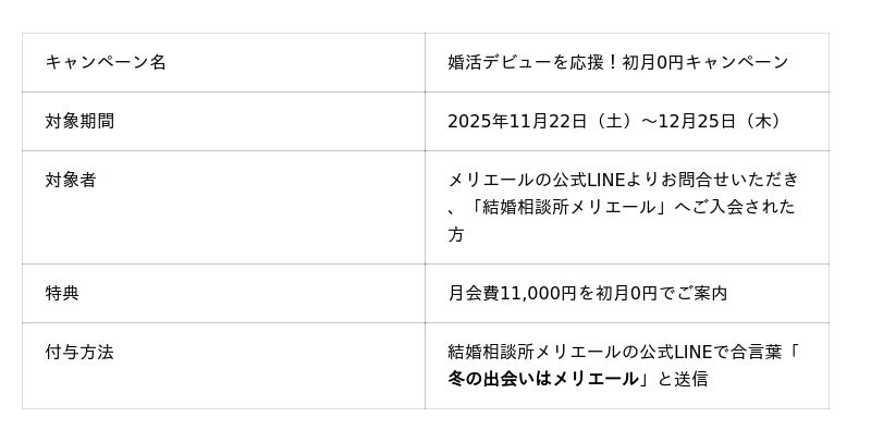 株式会社クリア(本社:東京都渋谷区、代表取締役社長:勝沼 潤)は、同社が運営する結婚相談所「メリエール(IBJ加盟店)」にて、2025年11月22日(土)より【婚活デビューを応援!初月0円キャンペーン】を開催いたします。