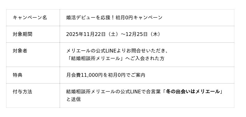 株式会社クリア(本社:東京都渋谷区、代表取締役社長:勝沼 潤)が運営する「結婚相談所メリエール(IBJ加盟店)」は、2025年11月22日(土)より、期間限定で「婚活デビューを応援!初月0円キャンペーン」を開催いたします。