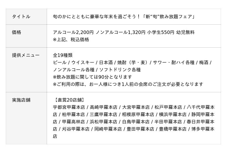 また、年末の忘年会やご友人との集まりなど、宴席が増えるこの季節にぴったりの「1組6名様」で楽しめる大人数プランとしてご利用いただけます。全国の甲羅本店で実施いたしますので、お気軽にご応募の上、お近くの店舗で、旬のかにとともに豪華な年忘れを過ごすことができます。