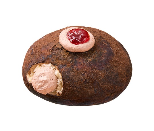 ふわっとやわらかいドーナツの中に、エアリーなチョコホイップをKKDJ史上最もふんだんに詰め、表面にココアシュガーをまぶして見た目にもチョコレート感をプラス。仕上げにのせたチョコホイップの上には、甘酸っぱいフランボワーズジャムをアクセントとして重ねました。