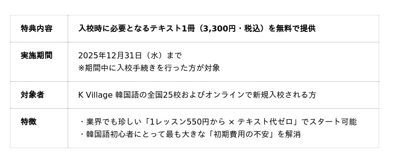 日本最大級の韓国語教室「K Village 韓国語」を運営する株式会社K Village(本社:東京都新宿区、代表取締役社長:桑原 元就)は、2025年12月末までに新規入校いただいた方を対象に、韓国語テキスト(3,300円・税込)を無料で提供するキャンペーンを実施中です。