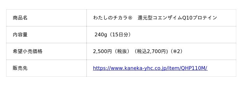 株式会社カネカ(本社:東京都港区、社長:藤井 一彦)は、グループ会社であるカネカユアヘルスケア株式会社(本社:東京都港区、社長:三宅 郁子)を通じて、『わたしのチカラ(R) 還元型コエンザイムQ10プロテイン』を11月25日(火)より発売開始します。