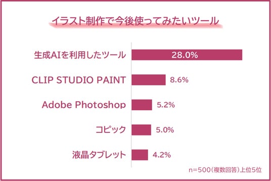 「今後使ってみたいツール」として圧倒的に多かった回答は「生成AIを利用したツール(28.0%)」でした。AIがアイデア出しや構図提案をしてくれることへの期待が高く、学びやスキルアップのサポートとして活用したいという意識も伺えます。