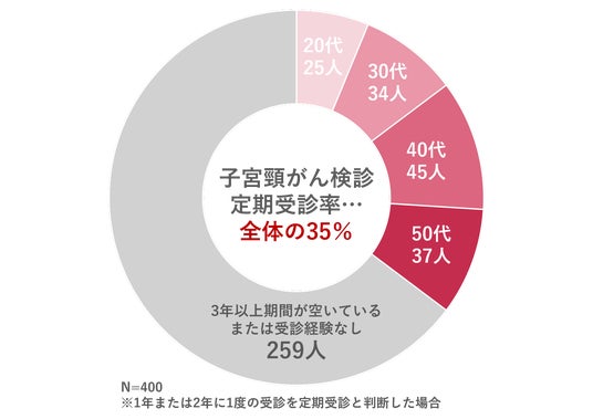 クレアージュが実施した調査では、20~50代の女性400名のうち子宮頸がん検診を受診したことがあるという女性は全体の47%でした。年齢別では40代の受診経験率が最多で、次いで50代が多い結果に。受診経験率が最も低い年代は20代で37%となっています。また、子宮頸がん検診は原則2年に1度の定期健診が大切ですが、2年に1度以上の頻度で定期的に受診できている女性は全体の35%で、約3人に1人の定期受診率であることが分かりました。